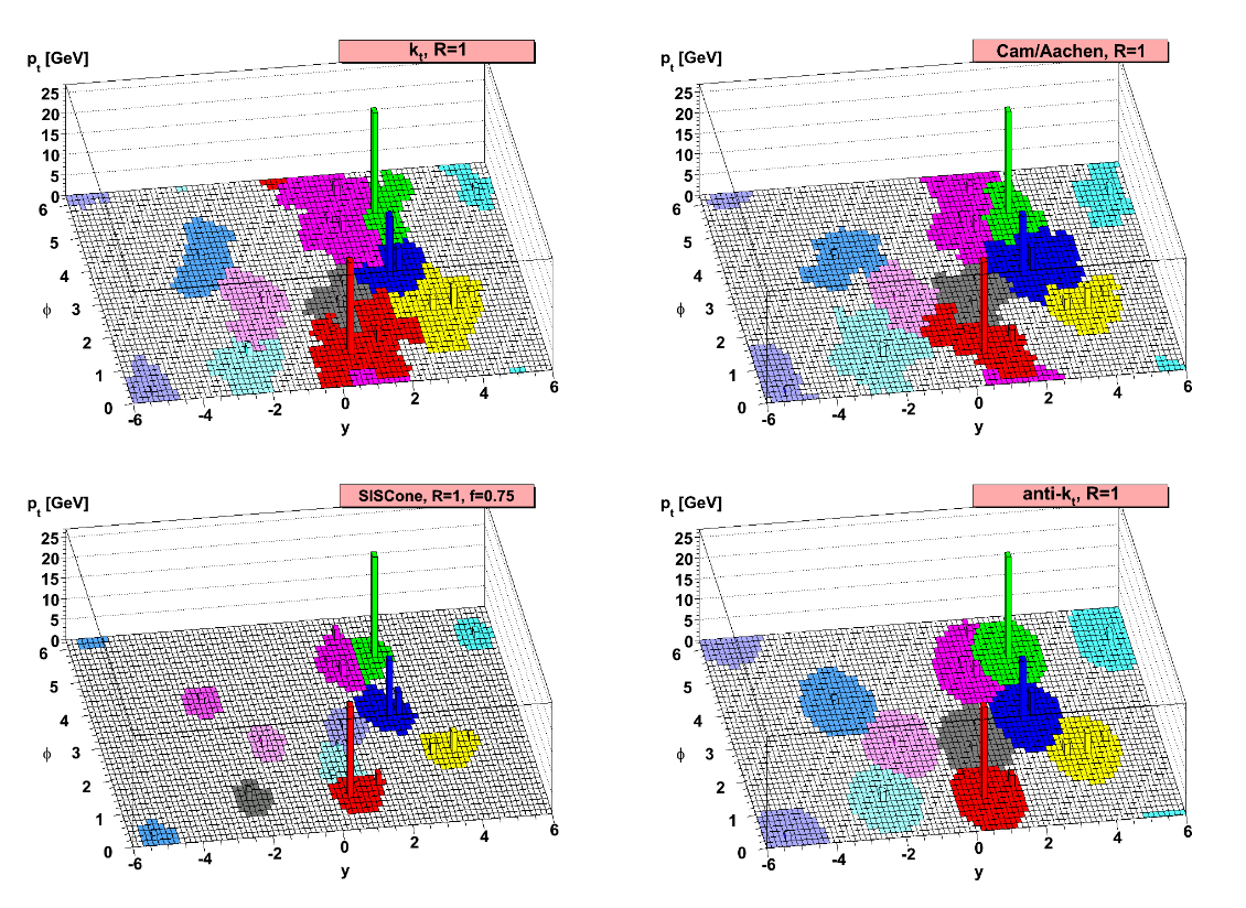 ![Comparison of the k_t, Cambridge/Aachen, SISCone and anti-k_t algorithms clustering a sample parton-level event